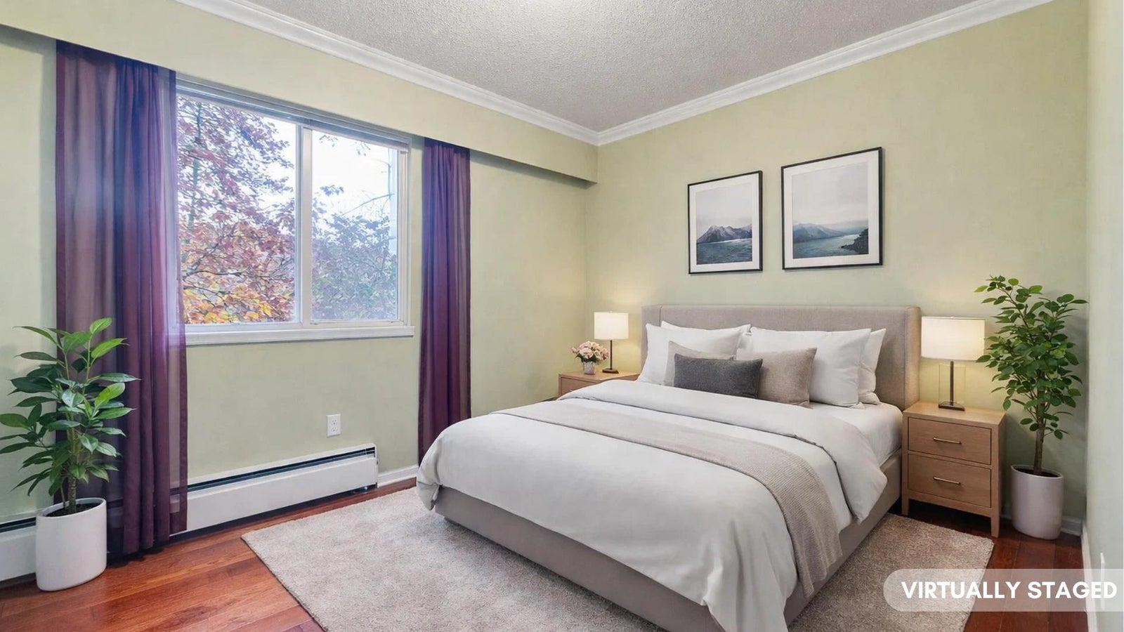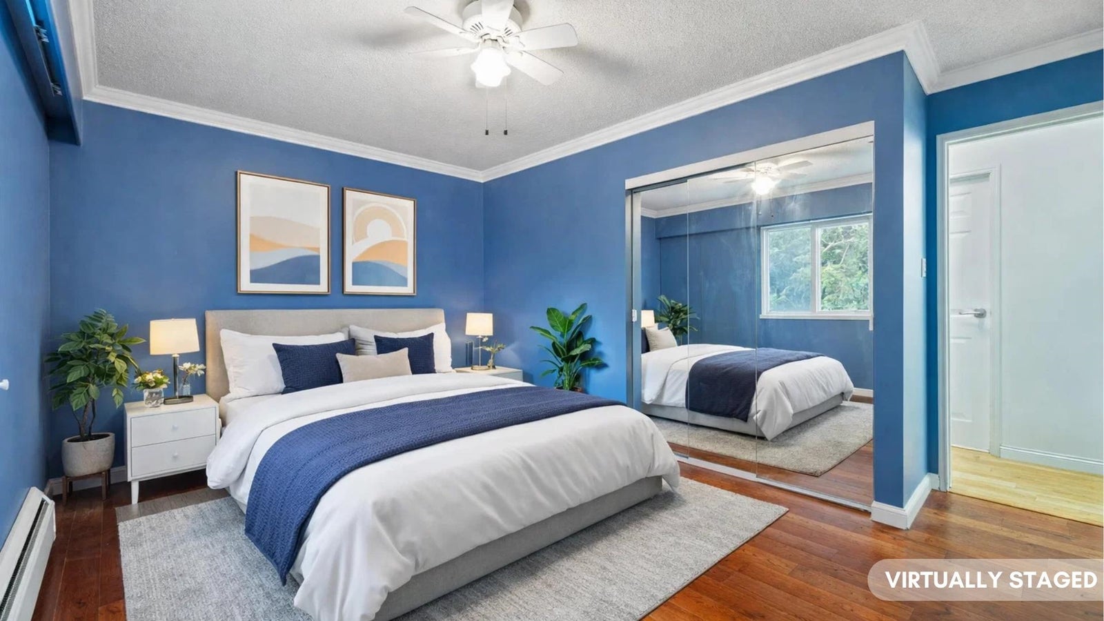 Top Floor Corner unit, large 2 bedroom condo located close to transit, parks, shopping, restaurants & commuter routes. Sungod Villa is a well managed condo building offering beautiful outdoor patio areas, gardens around , inground pool and loads of additional parking in the heart of North Delta. The condo offers a spacious and bright layout with real hardwood flooring and a sunny east facing balcony and southern facing bedrooms. Updated kitchen, updated electrical panel, building full plumbing replacement in 2023, approx 10 year old roof, newer intercom and some updated exterior siding. Heat & hot water included in maintenance fee. Perfect for investors or first time buyers!